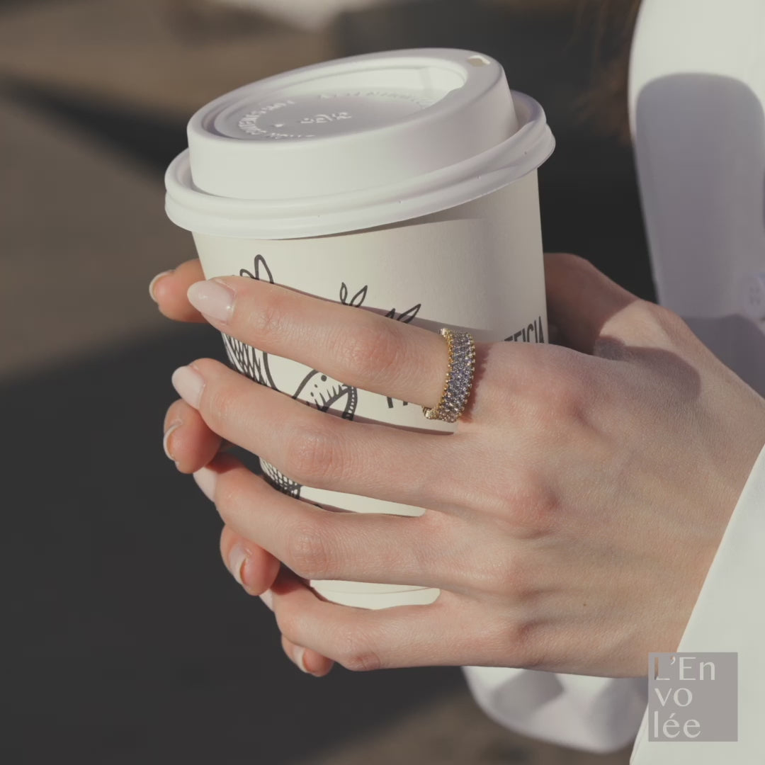 A dazzling display of brilliance, this ring features three rows of sparkling Cubic Zirconia meticulously set in a pave design, creating an endless loop of shimmer. Plated in 14K gold, the intricate detailing and radiant finish make it a stunning statement piece that catches the light from every angle. Perfect for adding a touch of luxury to any occasion.