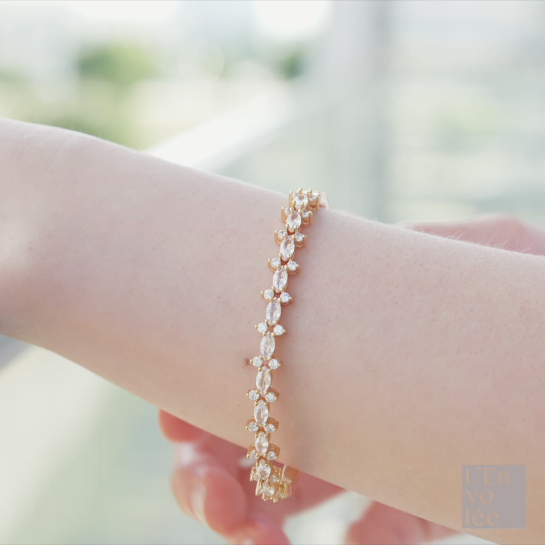 A delicate touch of elegance. This dainty bracelet features marquise-cut Cubic Zirconia stones arranged into charming floral patterns, catching the light with every move. Available in your choice of gold or silver tone, it’s finished with an adjustable slider clasp for a perfect fit on any wrist. Lightweight, feminine, and made for effortless everyday beauty.