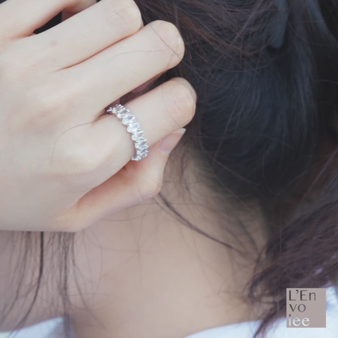 Odette is an elegant celebration of soft curves and endless brilliance. This oval-cut eternity band showcases a continuous row of shimmering stones, set in a polished silver tone. Perfect for stacking or wearing solo, it adds effortless sophistication to any look—timeless yet modern, bold yet refined.